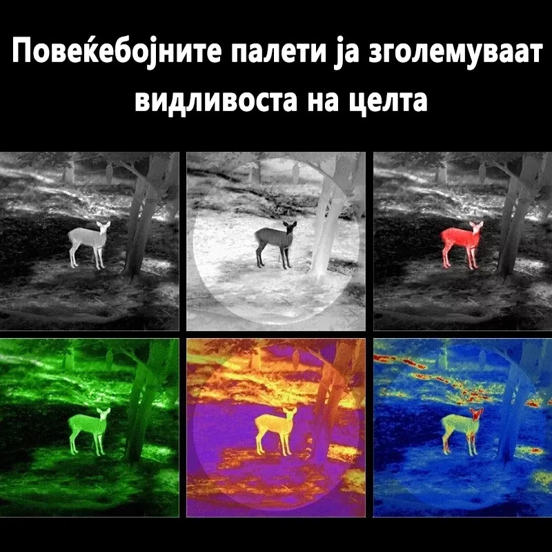 Јасни и контрастни термички слики овозможуваат подобра идентификација на животните, нивните екстремитети, па дури и најситните детали – гранки, лисја, трева и земја.